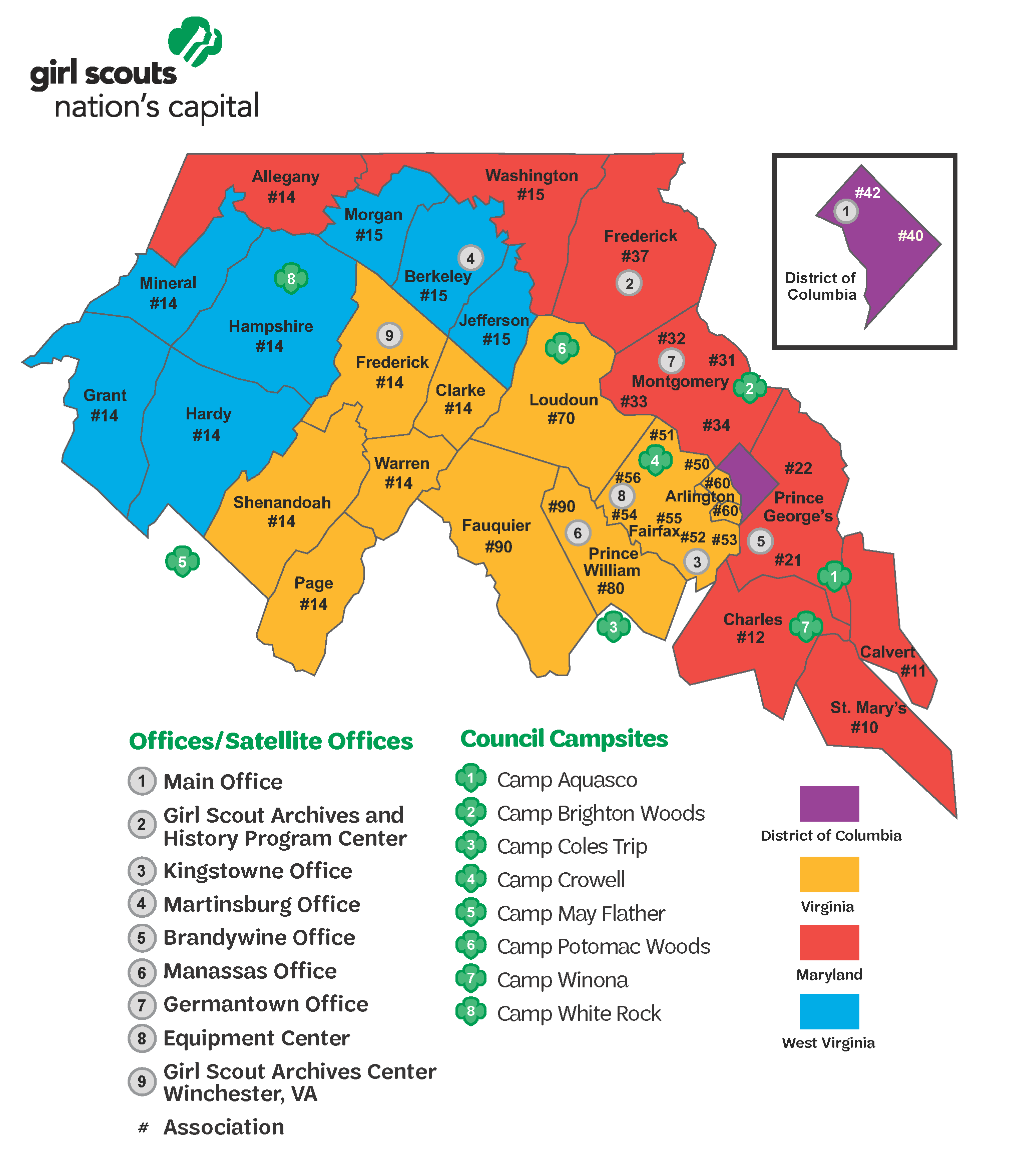 Girl Scouts Nation’s Capital serves the Greater Washington Region, which includes the District of Columbia and 25 counties in Maryland, Virginia and West Virginia.