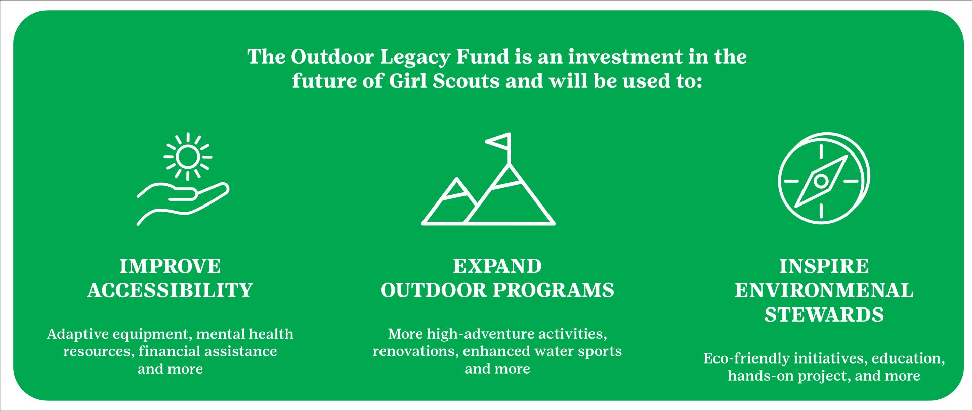The Fund will play a pivotal role in building confidence and leadership skills in Girl Scouts by expanding outdoor program opportunities and will ensure that every Girl Scout, regardless of background, abilities, or circumstances, can develop outdoor skills, forge lasting friendships, and connect with nature in a profound way.