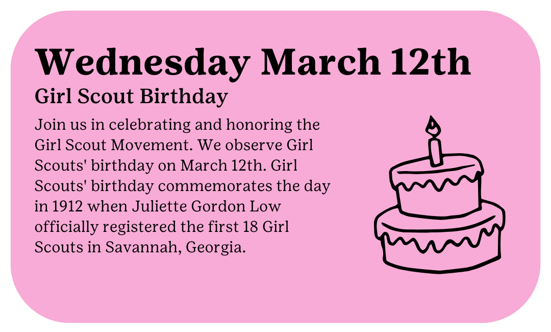 It's time to celebrate! Starting March 9th, 2025, through March 15, 2025, join us in celebrating and honoring the Girl Scout Movement. The Girl Scout Birthday on March 12 commemorates the day in 1912 when Juliette Gordon Low officially registered the organization’s first 18 girl members in Savannah, Georgia. This year, 2025, represents our 113th birthday! Complete the Girl Scout Week challenge to earn your Girl Scout Week 2025 commemorative Patch!