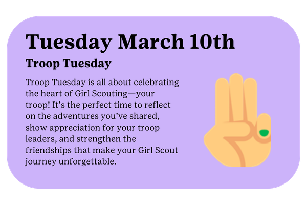 Girl Scout Week 2026 is a special time to celebrate the impact of Girl Scouts and the values we live every day. Throughout the week, Girl Scouts are invited to complete one simple activity each day that reflects leadership, kindness, community, and courage. After completing the activities, Girl Scouts can submit their Girl Scout Week Change Card to earn the 2026 Girl Scout Week patch.