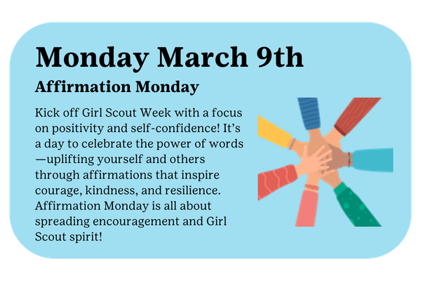 Complete one challenge each day of the week and submit your completed challenge card to earn your Girl Scout Week 2026 commemorative Patch! Completed Cards must be submitted by Friday April 17th via the online form below.